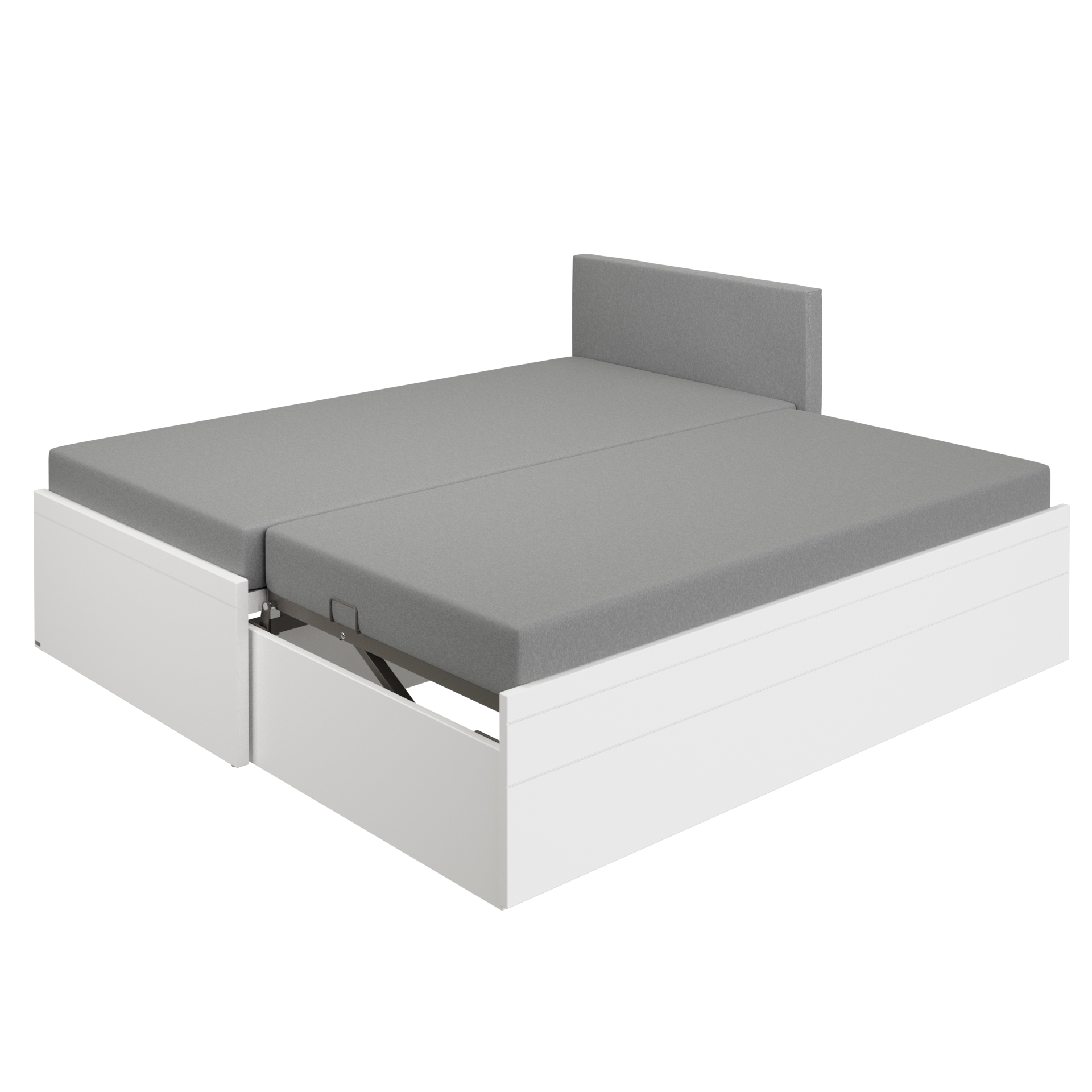 Universalliege Flynn - Flexible Lösung fürs Kinderzimmer und Jugendzimmer: Die Universalliege, die nicht nur Liege, sondern auch Sofa und Doppelbett sein kann. Sofa, das wenig Platz braucht. Als einfache Liege oder mit Kissen und Rückenrollen als Sofa braucht Flynn nur einen Platz von 200 x 100 cm. Weil die Universalliege ein niedriges Haupt hat, passt sie auch gut unter Dachschrägen. Mit einem einfachen Handgriff kann man die Liege hervorziehen und hochklappen. Die gleiche Höhe macht Flynn zu einem komfortablen Doppelbett mit einer Liegefläche von 200 x 198,5 cm.