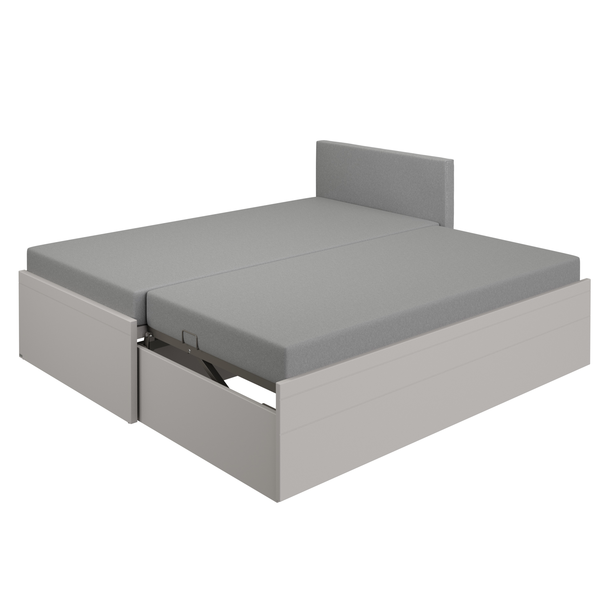 Universalliege Flynn - Flexible Lösung fürs Kinderzimmer und Jugendzimmer: Die Universalliege, die nicht nur Liege, sondern auch Sofa und Doppelbett sein kann. Sofa, das wenig Platz braucht. Als einfache Liege oder mit Kissen und Rückenrollen als Sofa braucht Flynn nur einen Platz von 200 x 100 cm. Weil die Universalliege ein niedriges Haupt hat, passt sie auch gut unter Dachschrägen. Mit einem einfachen Handgriff kann man die Liege hervorziehen und hochklappen. Die gleiche Höhe macht Flynn zu einem komfortablen Doppelbett mit einer Liegefläche von 200 x 198,5 cm.