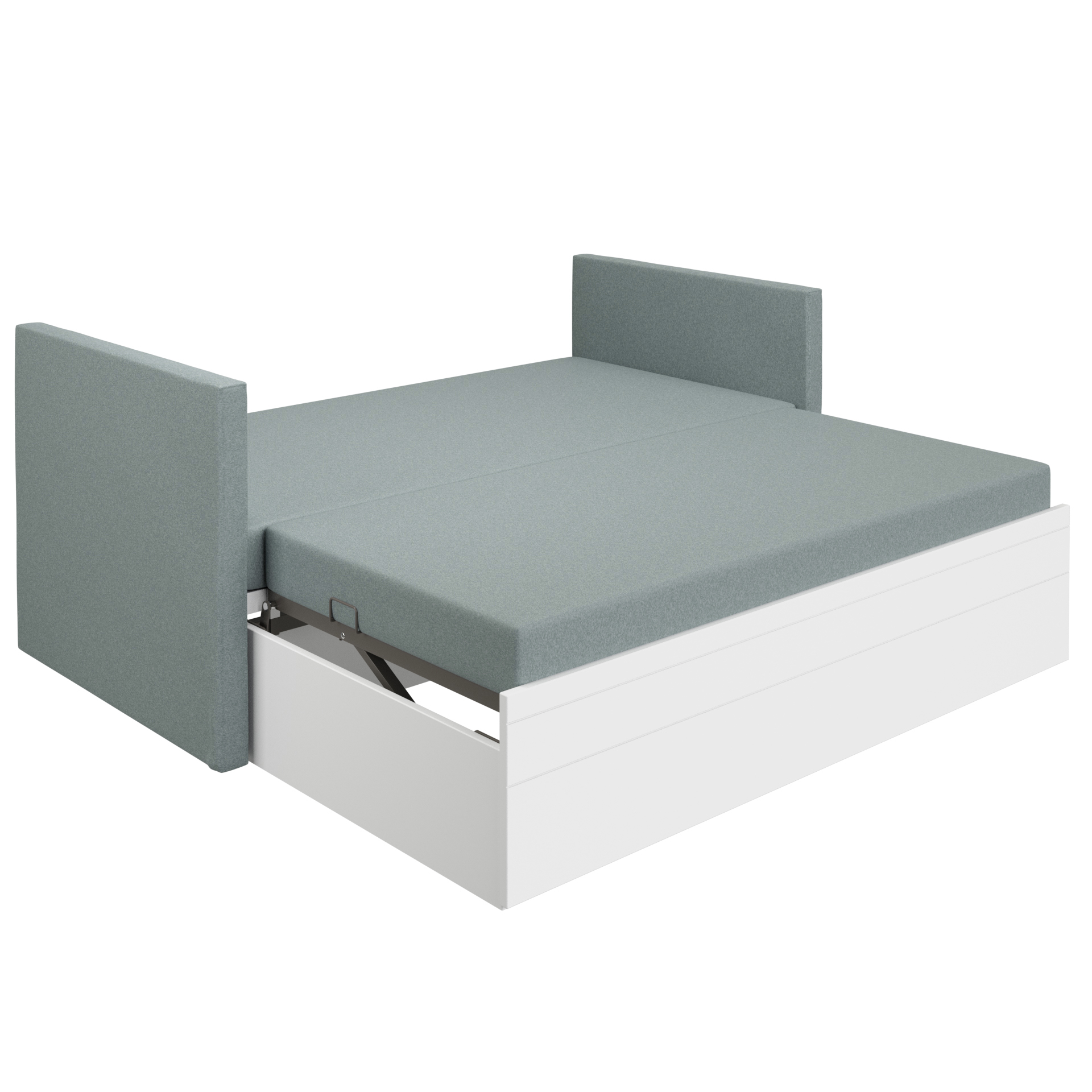 Universalliege Flynn - Flexible Lösung fürs Kinderzimmer und Jugendzimmer: Die Universalliege, die nicht nur Liege, sondern auch Sofa und Doppelbett sein kann. Sofa, das wenig Platz braucht. Als einfache Liege oder mit Kissen und Rückenrollen als Sofa braucht Flynn nur einen Platz von 200 x 100 cm. Weil die Universalliege ein niedriges Haupt hat, passt sie auch gut unter Dachschrägen. Mit einem einfachen Handgriff kann man die Liege hervorziehen und hochklappen. Die gleiche Höhe macht Flynn zu einem komfortablen Doppelbett mit einer Liegefläche von 200 x 198,5 cm.