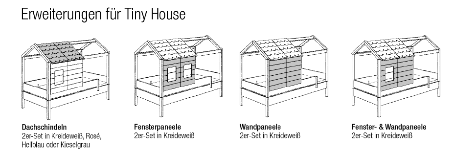 Die universellen Betten zum Kuscheln. Wandelbare Kinderbetten. Ein Eigenheim schon für Kinder: Das Paidi Tiny House ist vielfältig kombinierbar. Ein gemütlicher Rückzugsort und sicherer Schlafplatz für Mädchen und Jungs. Gut geschütztes Haus - Nicht nur das Dach lässt sich mit kreideweißen, rosafarbenen, hellblauen oder kieselgrauen Dachschindeln decken, sondern auch die Vorderseite des Tiny House mit Fenster- und Wandpaneel schließen.