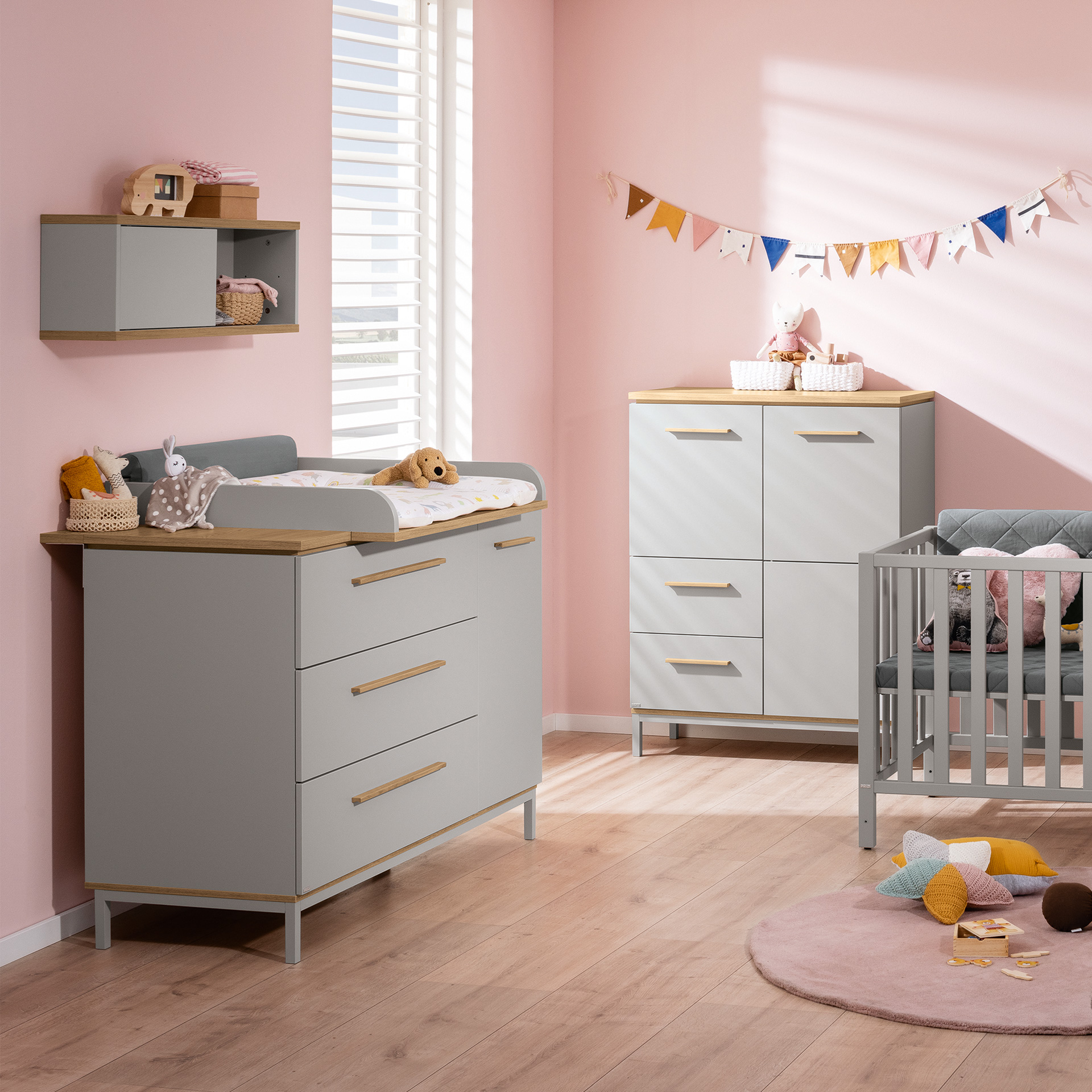 Gemütlichkeit neu gedacht – asymmetrische Hingucker. Babyzimmer in Kieselgrau mit Eiche-Montana Deine Begeisterung für die natürliche Optik und die gemütliche Ausstrahlung von Holzdekor verbindet sich nahtlos mit deiner Liebe zu klaren Linien und dezenten Farben? Benne vereint Kieselgrau mit Eiche-Montana in einer einzigartigen Möbelserie, mit der du stilsicher einen zeitgemäßen Wohlfühlort für dein Kind schaffst, der mühelos mitwächst. Erlebe mit Benne die ideale Symbiose aus Funktionalität, Ästhetik und Liebe im Babyzimmer.