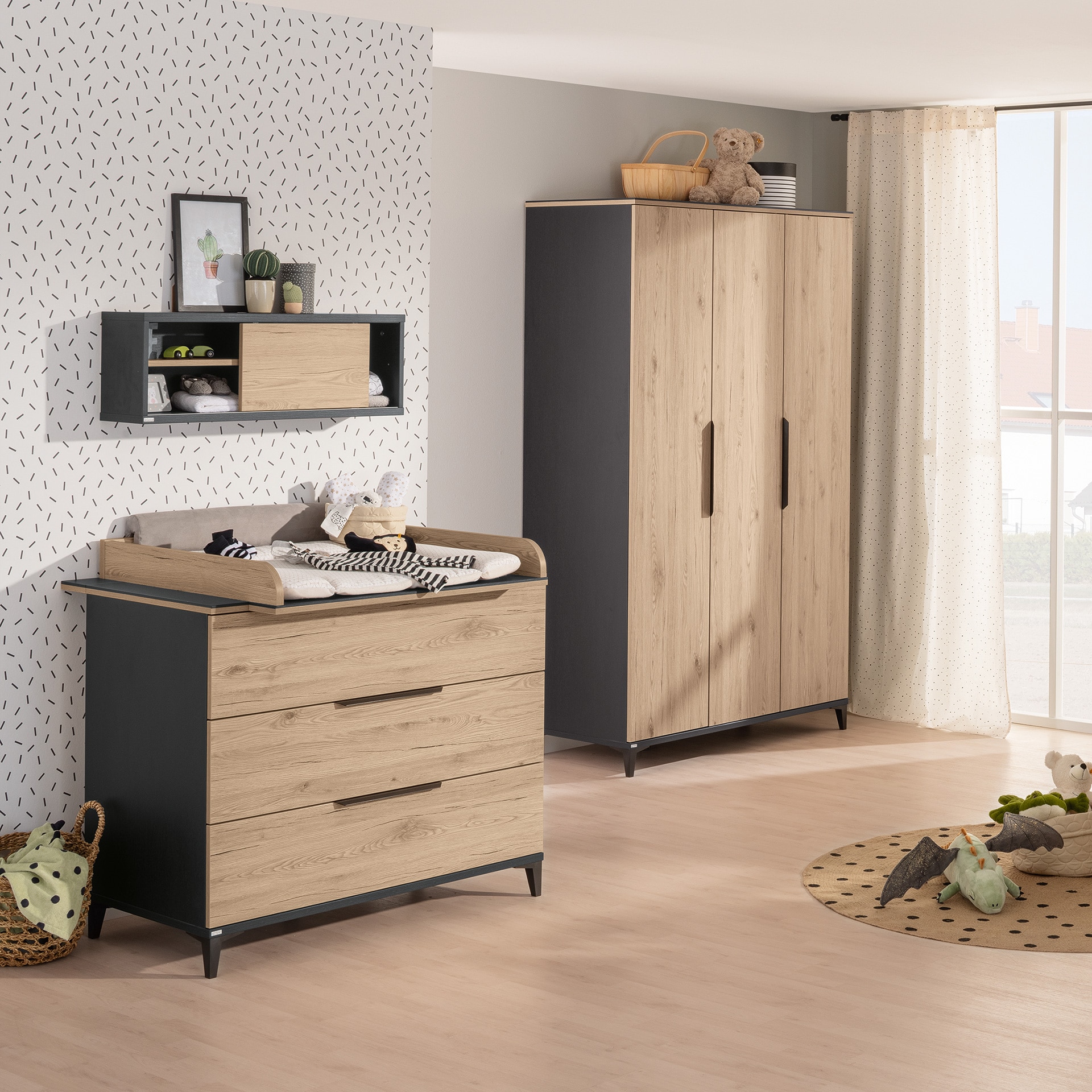 Industrial Style. Starke Kontraste fürs Kinderzimmer Tomke zeichnet sich durch das Zusammenspiel zweier Farbtöne aus: Schwarze Korpusse rahmen die Fronten aus warmem Holzdekor ein und verleihen den Möbeln einen urbanen Look. Die holzfarbenen Einlegeböden scheinen in den schwarzen Regalen zu schweben und setzen Schönes sowie Nützliches in Szene. So gestaltest du ein zeitloses Babyzimmer, das später auch als Grundlage für ein Kinder- oder Jugendzimmer funktioniert. Babybett Tomke – innovativ und komfortabel. Unsere Babybetten sind mit dem patentierten PAIDI-Schlupfsprossenmechanismus ausgestattet. Damit lassen sich die Gitterstäbe leicht herausnehmen und genauso komfortabel wieder einsetzen.