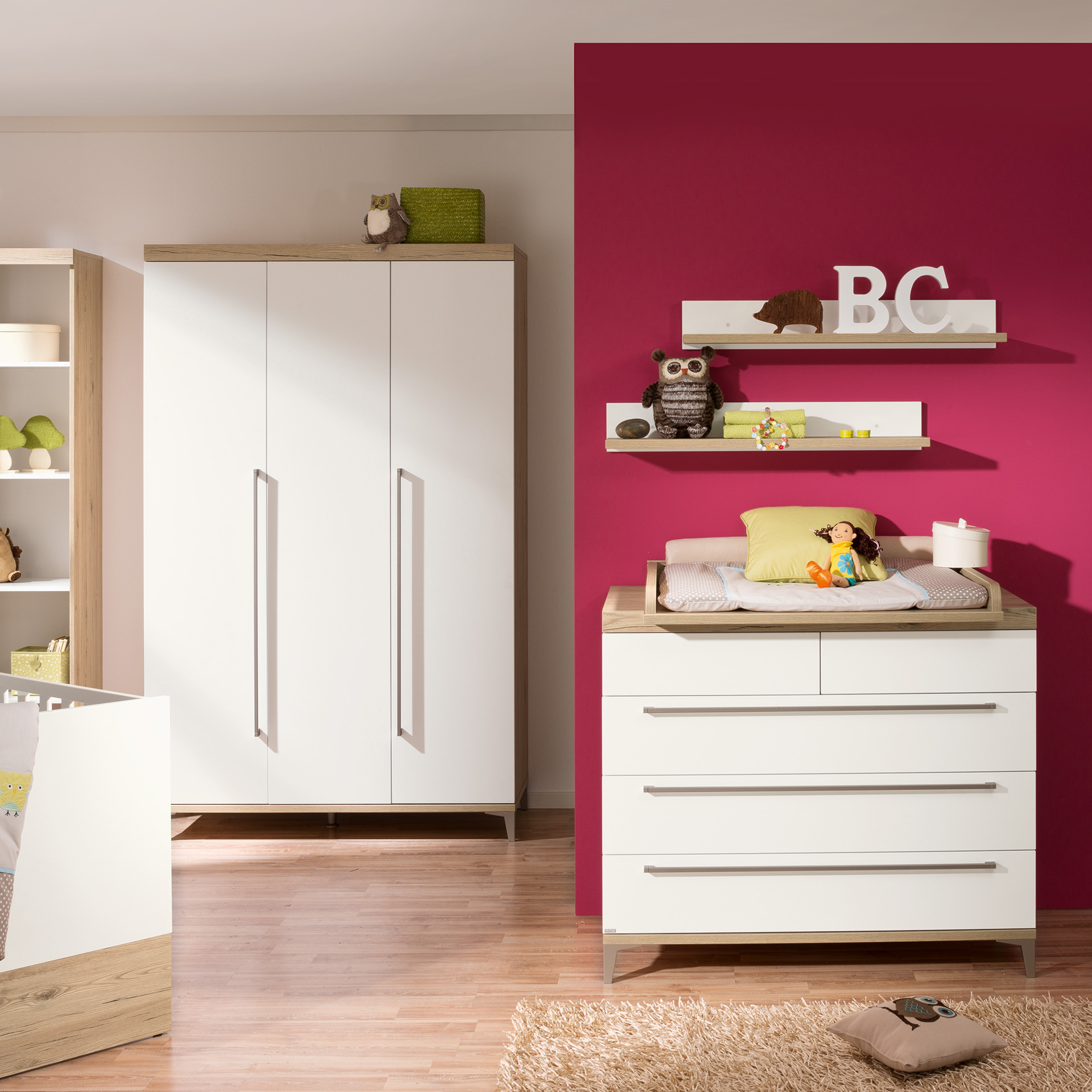 Durchdacht bis ins Detail. Kontraste in Holzoptik - Die gepaarte Eleganz von natürlichem Holzlook und strahlendem Weiß verleiht Remo eine zeitlose Modernität. Der stilvolle Kontrast trifft auf pure Funktion. Die Schiebetüren bremsen sanft für Kinderhände und schließen leise von selbst. Push-to-open Funktion und Vollauszug ermöglichen einen schnellen und einfachen Zugang zu den wichtigsten Utensilien. Ein Bett, viele Umbaumöglichkeiten - Wird dein Kind zu groß fürs Babybett, kann dieses mit dem Sicherheits-Set in die Juniorstufe verwandelt werden. Lasse dich von unseren Ergänzungen inspirieren: Mit einer Leiter kann dein Kind im Nu allein aus dem Bett klettern, das Spielzelt sorgt für einen kleinen gemütlichen Rückzugsort.