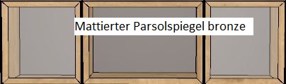 - Mattierter Parsolspiegel: Bei dem mattierten Parsolspiegel handelt es sich um ein bronzedurchgefärbtes Floatglas mit Spiegelbeschichtung, welches bei einer ganzflächigen Sandstrahlung die Spiegelung einbüsst. Hierbei handelt es sich um eine traditionelle Glasveredelung, durch die ein hochwertiger Matt-Effekt erzeugt wird.