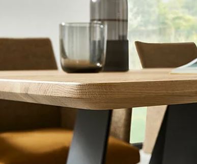 - Tischplatte: Massivholz Erle, natur oder Massivholz Wildeiche, soft gebürstet