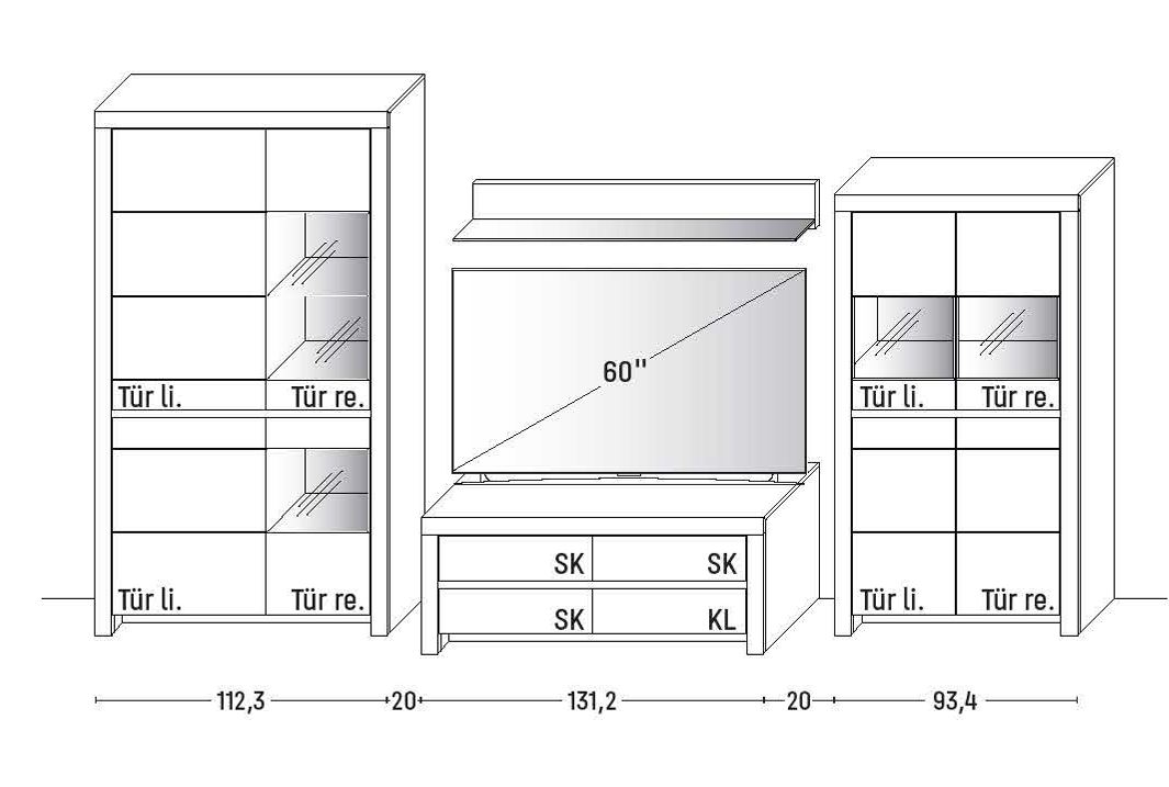 - 3106 = Zeilenschrank 5123, Medienelement 1355, Wandbord 0130, Zeilenschrank 4940