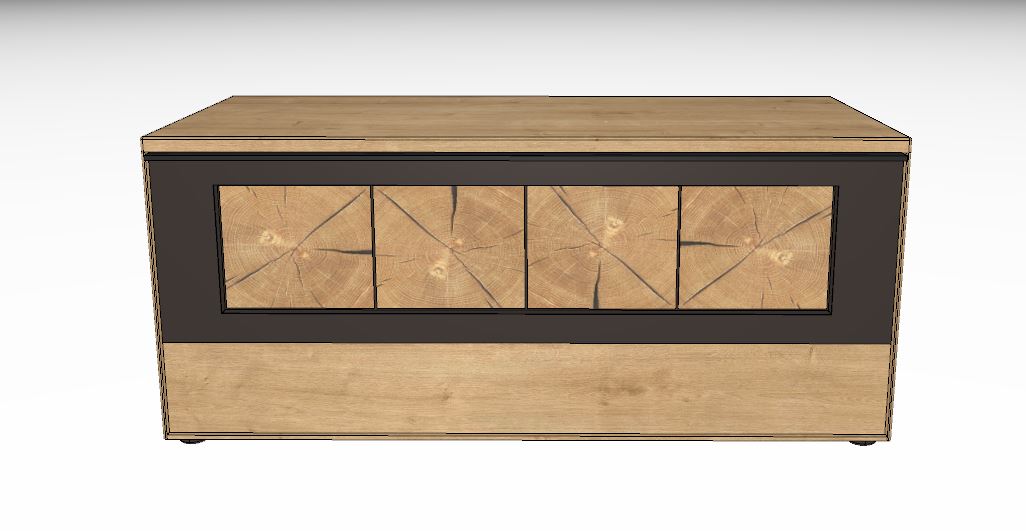 • Für die Front-Applikation werden ausgewählte Eichenstämme "vor Kopf" abgesägt. Dabei entstehen einzigartige Hirnholzscheiben, welche im Anschluss auf einen schwarzen MDF- Träger geleimt werden. Jedes Stück ist ein echtes Unikat der Natur und als schmückender Möbelakzent ein wahres Highlight, denn keine Maserung und kein Riss gleicht dem anderen.