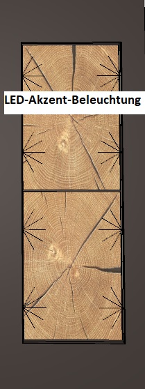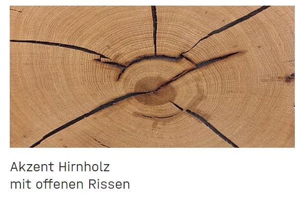 - Für die Front-Applikation werden ausgewählte Eichenstämme "vor Kopf" abgesägt. Dabei entstehen einzigartige Hirnholzscheiben, welche im Anschluss auf einen schwarzen MDF- Träger geleimt werden. Jedes Stück ist ein echtes Unikat der Natur und als schmückender Möbelakzent ein wahres Highlight, denn keine Maserung und kein Riss gleicht dem anderen.