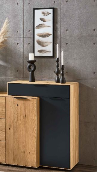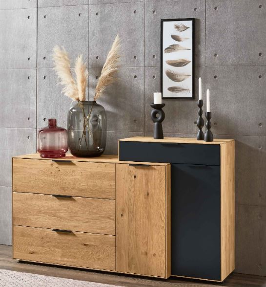 Modell: WM 2140 Beschreibung: Sideboard 3 Schubkästen 1 Tür (dahinter 1 Boden / 2 Fächer) Holzausführung (Korpus und Front): Wildeiche massiv, soft gebürstet Maße: Breite: ca. 131,5 cm Höhe: ca. 83,9 cm Tiefe: ca. 45,2 cm Ausführung (wählbar): 2953 = Türanschlag links 2954 = Türanschlag rechts Zubehörempfehlung: Z091 = Vollauszug für 3 Zargen 8347 = Holz Einlegeboden, B 37,6 cm Material: Korpus und Front: Massivholz Wildeiche, soft gebürstet Metallteile: Metall pulverbeschichtet, carbonfarbig Hinweise: Auslieferungshinweis: Alle Elemente sind fest verleimt und komplett vormontiert – nicht zerlegbar! Elegante und ergonomische Griffprofile Gedämpfte und langlebige Beschlagstechnologie Schubkastenzargen aus Birke Sperrholz, Schubkastenböden und Rückwände aus hochwertigem Holzwerkstoff Raumklima: Holz ist ein natürlicher Werkstoff, der ständig Feuchtigkeit, je nach Feuchtigkeitsgehalt der Raumluft, aufnimmt und wieder abgibt. Ein ideales Raumklima für Mensch und Möbel besteht bei 19–23°C sowie bei 45–55% Luftfeuchtigkeit. Damit sich nichts verzieht oder Risse entstehen, sollte massives Holz möglichst geringen Raumluftschwankungen ausgesetzt werden. Besonders bei Neubauten ist auf die richtige Luftfeuchtigkeit zu achten und diese ggf. durch entsprechende Lüftung zu senken. WM 2140 Mit dem Programm WM 2140 von Wöstmann erleben Sie ausdrucksstarke Unikate aus edler Eiche, die Ihr Zuhause in eine Oase der Natürlichkeit verwandeln. Jedes Möbelstück ist ein aussagekräftiges Einzelmöbel mit einem prägenden Stilelement - dem ausdrucksstarken Kaminholz-Akzent. Die speziell ausgesuchten Eichen-Äste werden inklusive Rinde getrocknet, gespalten und in liebevoller Handarbeit auf einem geschwärzten Sperrholzträger appliziert. Das Ergebnis? Ein Möbelstück, das nicht nur ein Unikat ist, sondern auch die Natur in Ihr Zuhause bringt. Ein weiteres Designmerkmal sind die carbonfarbigen, strukturgepulverten Metall-Korpuselemente. Verspielt laufen sie an den Korpusseiten und Abdeckblättern über Eck oder werden als Front-Elemente an Schubkästen und Türen eingesetzt. Dieses besondere Qualitätsmerkmal erstreckt sich bis zu den hochwertigen Übereck-Verglasungen an Vitrinen, Hängeelementen sowie Side- und Highboards. Diese werden vom strukturgepulverten Metall eingefasst und bieten die perfekte Bühne für Ihre Deko-Highlights. Für ein dynamisches Höhenspiel können Sie auf besondere Aufsatz-Elemente für Lowboards, Sideboards und Highboards zurückgreifen. Ideal für Liebhaber moderner Wohnkombinationen, die ihrem Raum eine spielerische Dynamik verleihen möchten.