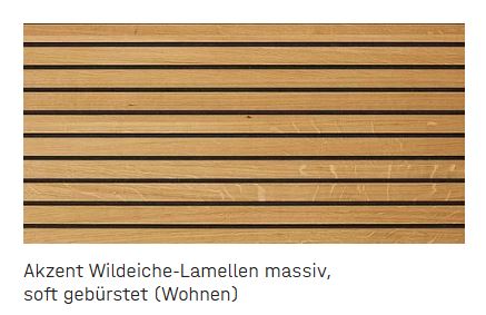 - Akzent: Erle-Lamellen massiv, natur oder Wildeiche-Lamellen massiv, soft gebürstet