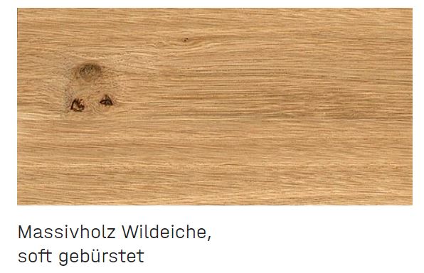 - Tischplatte und Ablageboden: Massivholz Wildeiche, soft gebürstet