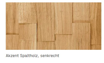 - Spaltholz-Akzent: Für den Akzent "Spaltholz" wird nur erstklassiges Echtholz verarbeitet. Die massiven Hölzer werden gespalten und in Handarbeit erneut zu einer dreidimensionalen Holzoberfläche zusammengefügt.